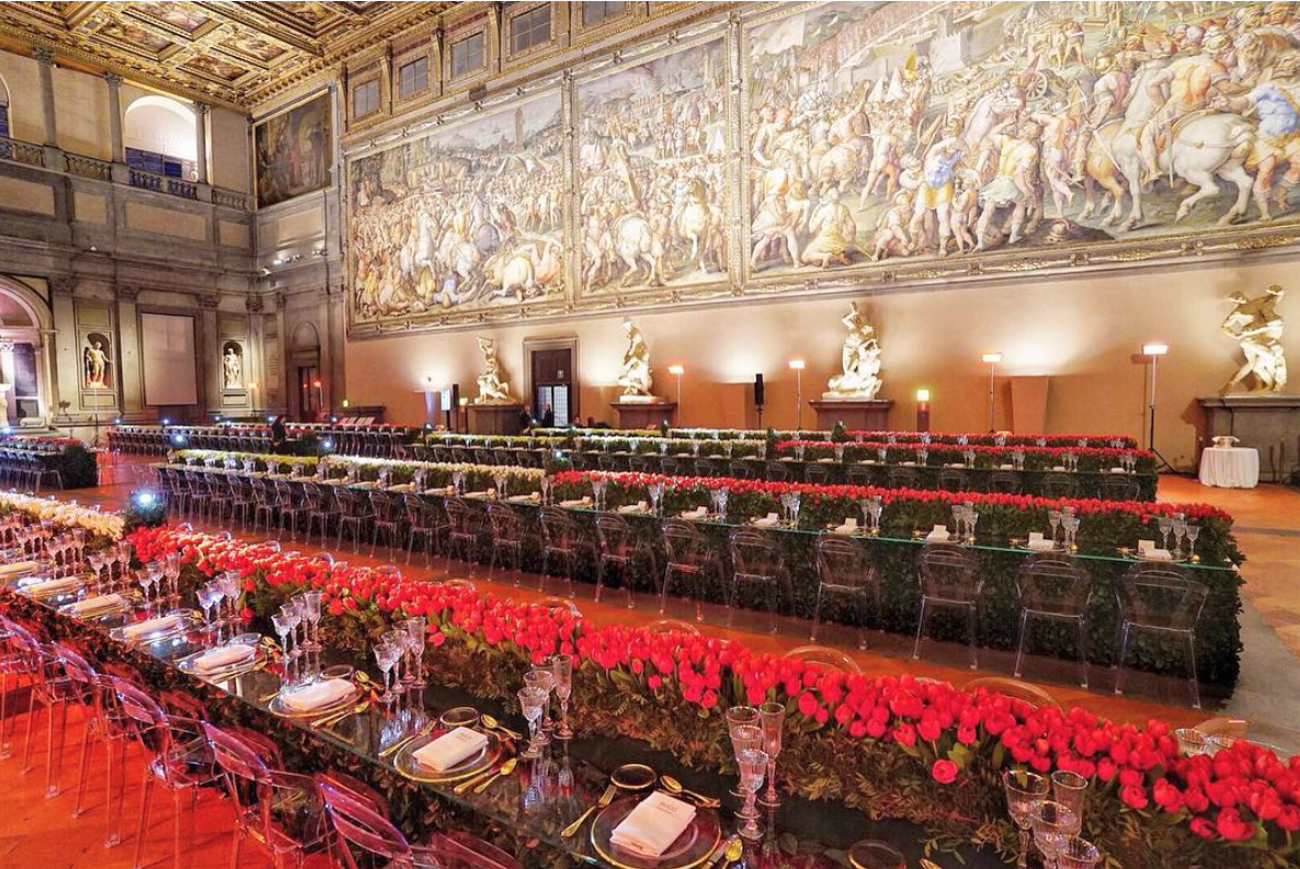 The dream setting of flower artist Vincenzo D'Ascanio for this year's Duco Travel Summit in Florence. The Titì fireproof transparent chairs only at design4rent